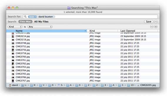 I’ve installed Mac OS X 10.7 (upgrading from 10.6) and was very interested to see how the new search tokens feature would work in Spotlight. But on my Mac it doesn’t. Here’s the result of a search for files whose name contains the text “david buxton”: